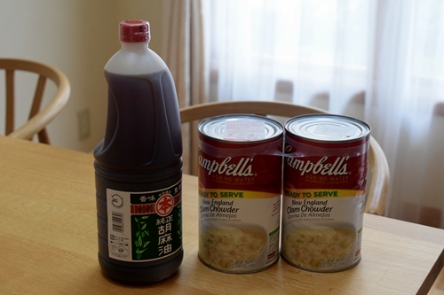 ごま油(1,650g、1,498円)とキャンベルクラムチャウダー(1.41kg×2缶、1,198円)♪