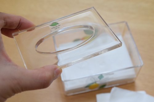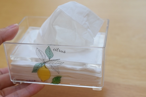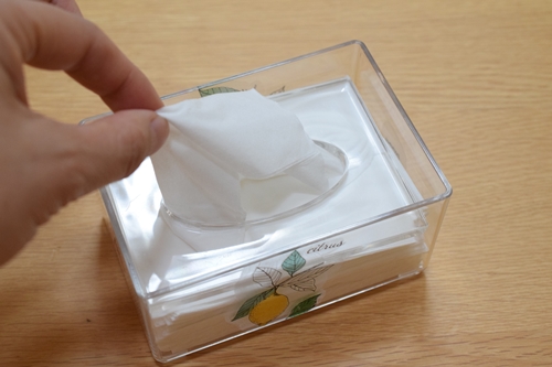 以前、お友達がプラスチックの透明ティッシュケースにデコパージュ(?)してプレゼントしてくれたのですが、このプラスチックの蓋の重みがちょうどよくて、ティッシュをふんわり抑えるのね。