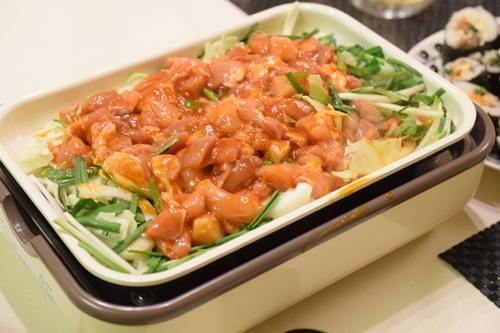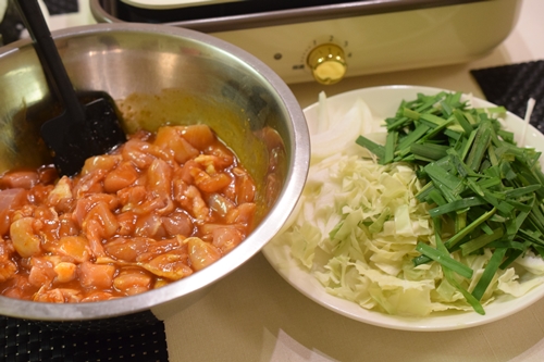 3.すき焼き鍋やフライパン、または小さめのホットプレートを強火にしてごま油を熱し、鶏もも肉と野菜を投入。
