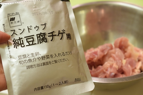 1.鶏もも肉を食べやすいサイズに切って、コストコの「スンドゥブチゲ」1袋を混ぜておきます。