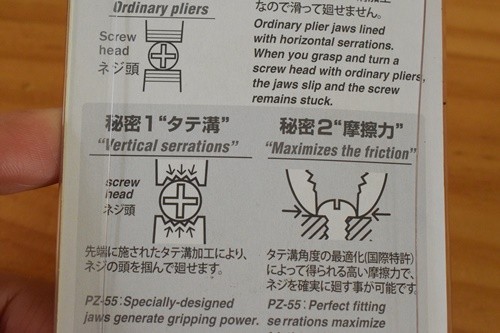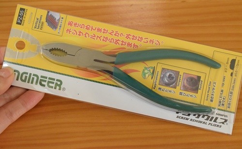 頭のつぶれたネジを外側から挟んで取り外すことができるというペンチ。