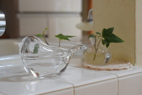 私は水をちょっと入れて、庭のアイビーをちょっと切って飾りました。