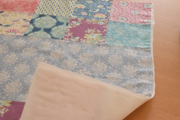 接着キルト綿と捨て布を重ねて、仕付けして。