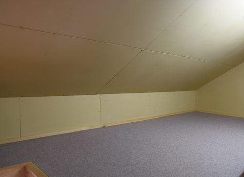 何も布団がないと小屋裏はこんな感じ。屋根の形にそって、9畳ぐらいの広さがあります。