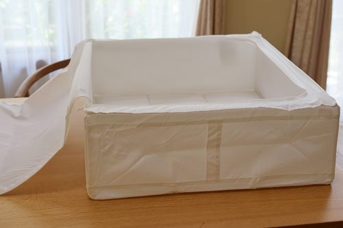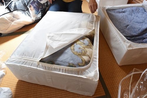 Sサイズにも薄掛けが入ります。Sサイズは季節外の服を入れて、クローゼットの上に置いてもよいと思います。