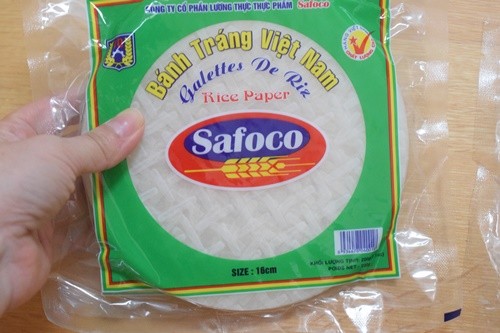 息子がベトナム旅行に行ったときにお土産に買ってきてくれた小さめの生春巻きの皮がテーブルで巻くのにちょうどよくて♪ボウルに水を入れて、濡らしたらすぐに柔らかくなります。