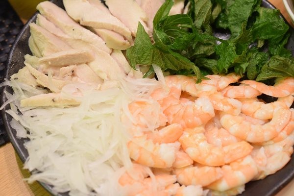 具は、にんじん、きゅうり、玉ねぎ、エビ、鶏むね肉(茹でたもの)、アボカド、ビーフン、シソ。
