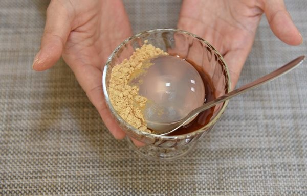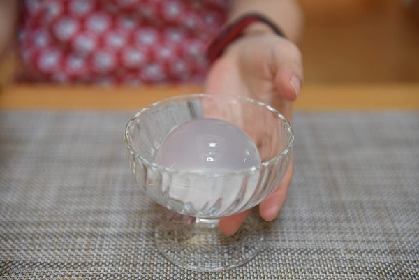 「水信玄餅」は山梨県北杜市白州町の「金精軒」が販売している和スイーツで、いつも大行列で大人気らしいです。見た目が水晶玉みたいで、水分が多くて、30分で溶けてしまう(?)ため、店舗で食べるのみの販売。