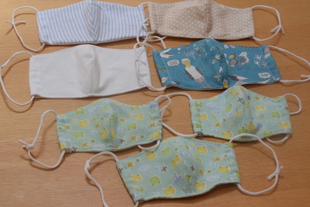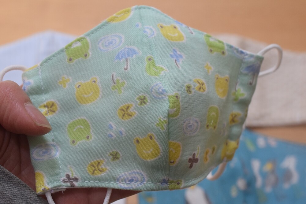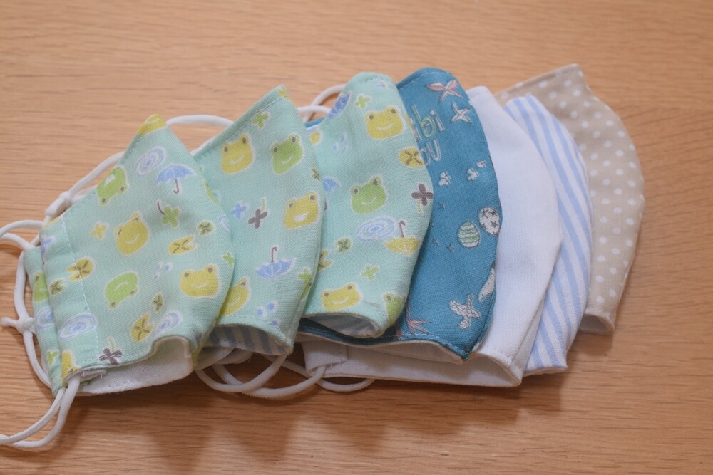 私の手芸用の布の山から、可愛い柄のダブルガーゼのハギレが発掘されたので、姪っ子ちゃん用に小さいサイズのマスクを作りました。