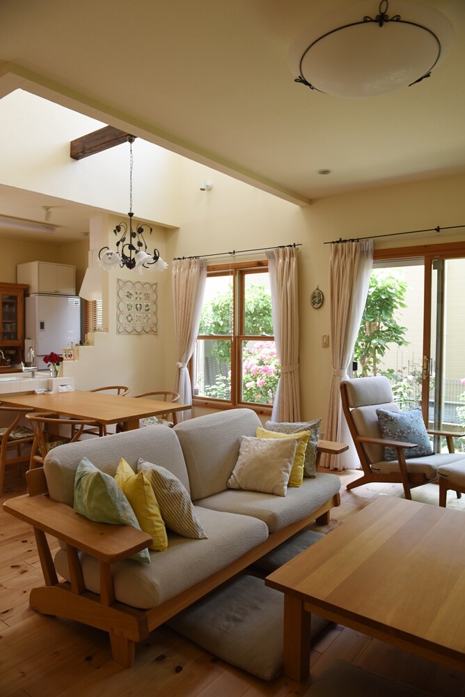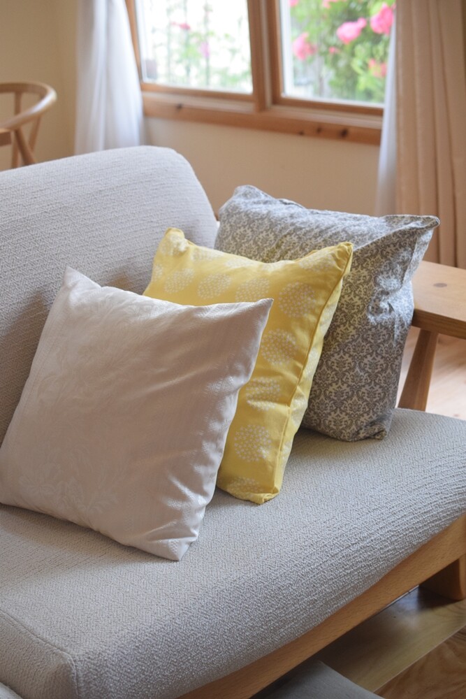 こちら側の一番手前のクッションのカバーは、昔、リビングカーテンの余り布で作ったもの。