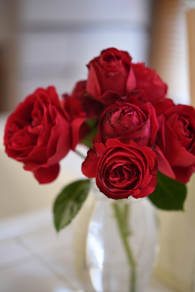 キッチンには庭のルージュ・ピエール・ドゥ・ロンサールを飾っています。