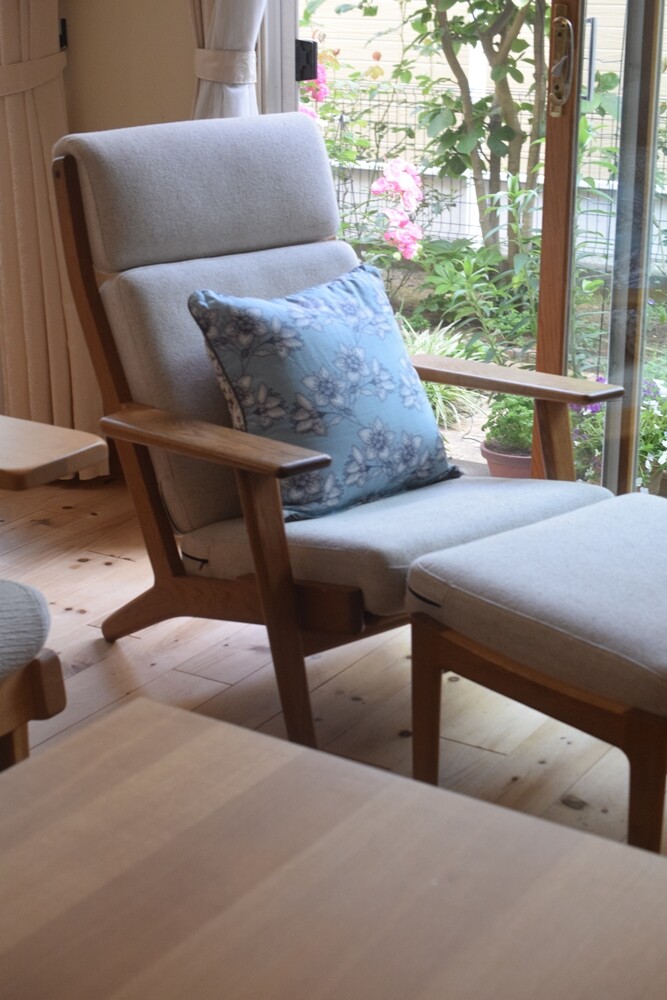 一人掛けソファの方に置いているのは、去年作ったクッションカバー♪