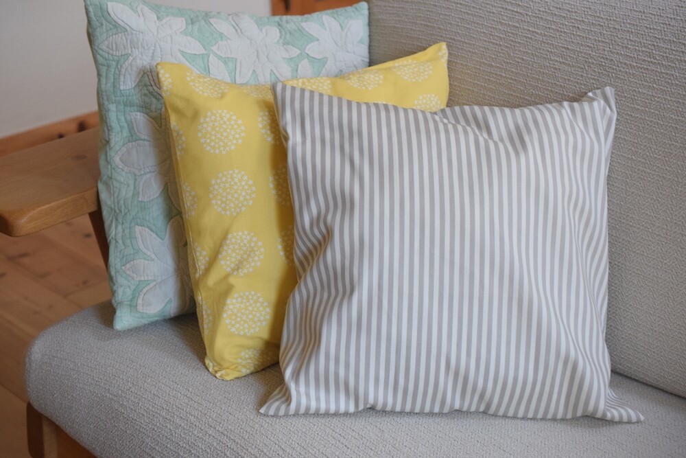 一番手前側のストライプのクッションカバーだけ、昨日作りました。