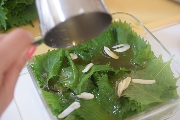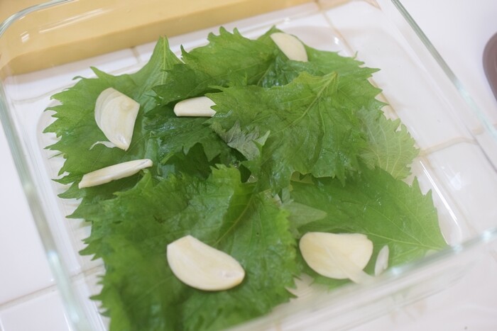 容器にシソを敷いて~ニンニクスライスをのせて~