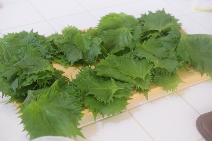 うちに大葉はないのだけれど、実家の庭にあったものを2~3日前にもらってきて、コップにさしてあったのでベストタイミングでした。