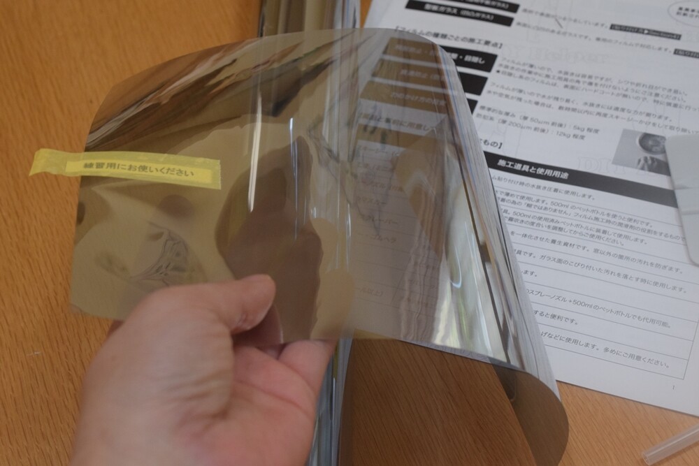 フィルムの裏にも施工液をスプレーしてから、フィルムをガラスにのせて。