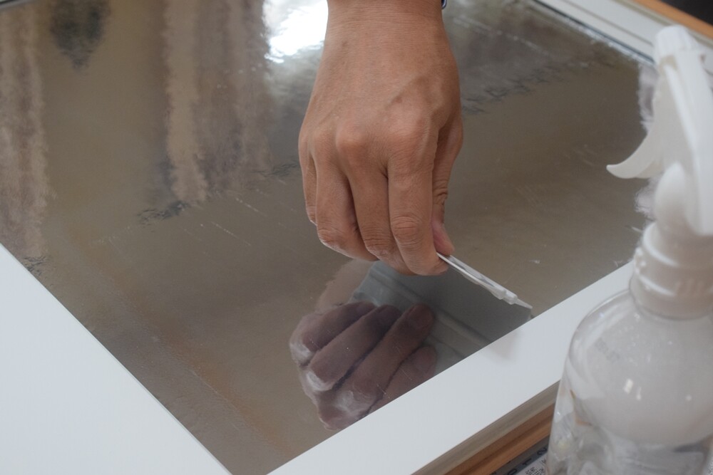 施工液をガラス面にシュシュシュとスプレーして。
