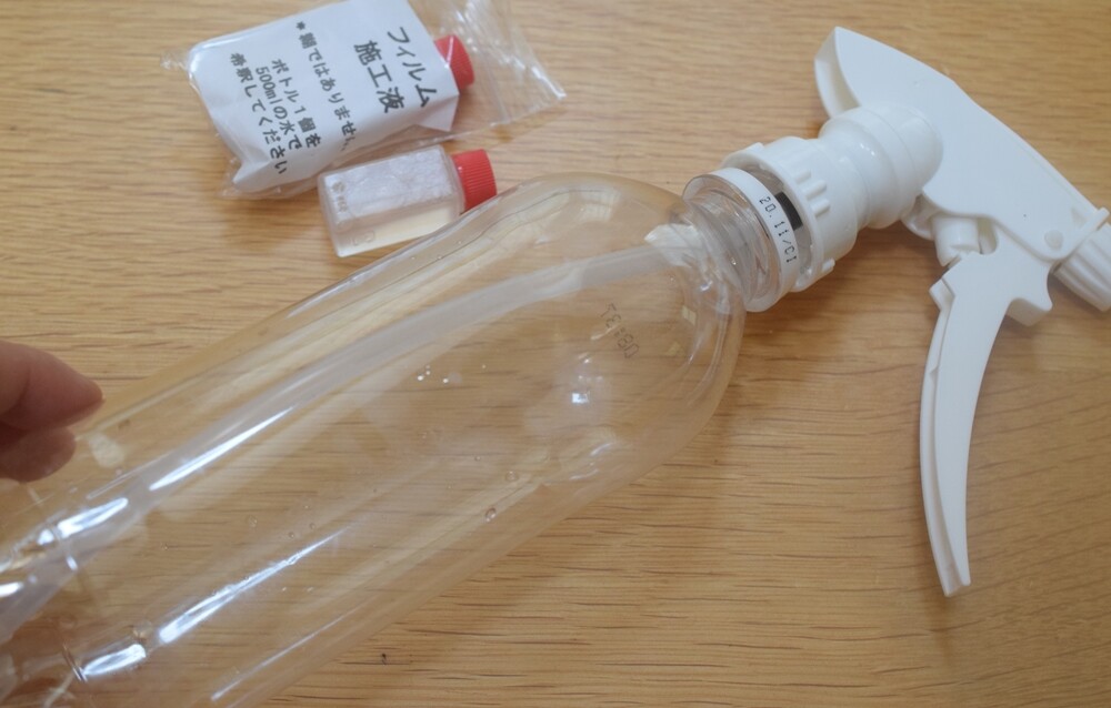 500mlのペットボトルに施工液を入れ、水を入れてスプレーを作ります。
