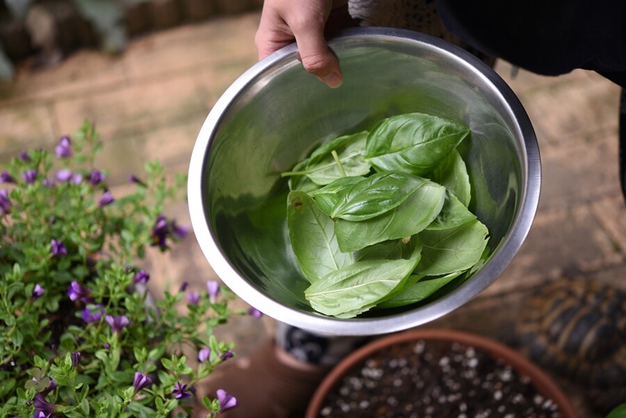 ボウル2つ分ぐらい収穫して…(まだまだ葉っぱは残っているけれど、とりあえずこれくらい)