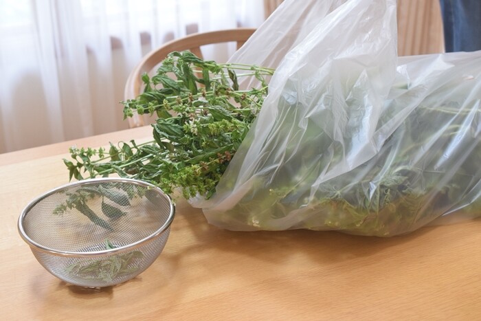 このファスナー付きネットに入れておくと、新聞紙やザルと違って、風が吹いてもバジルが吹き飛ばされないで安心です。