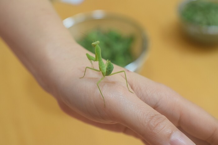 私はバッタとかカマキリ、セミぐらいなら今でも手で捕まえられます。弟と子どもの頃によく虫捕りしてたから、カマキリとか好きなの~。