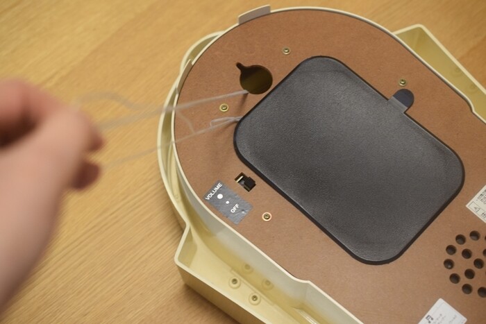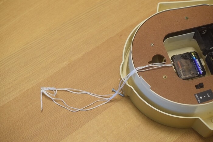 黒い電池の蓋を開いて、丈夫な紐を通してしっかり結びました。