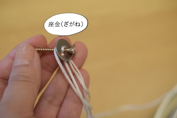 そして、座金の奥に紐を通して引っ掛けます。