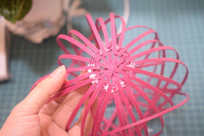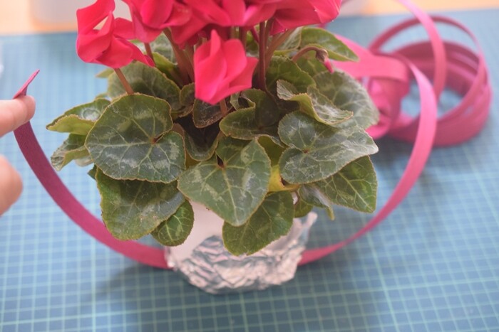 早速、作りました。シクラメンを置いてみて、だいたいの長さを決めて、紐をカット(適当~)それで、初めてダイソーのクラフトバンドを買ってみました(・∀・)