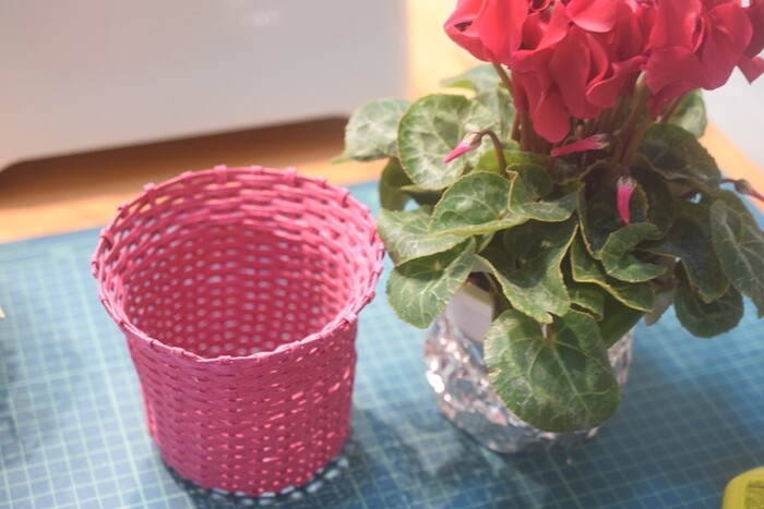 シクラメンを買ったときに白いプラスチックの鉢に入っていたのですが、そのままでは可愛くないのでカバーを作ったの~( ̄ー ̄)♪