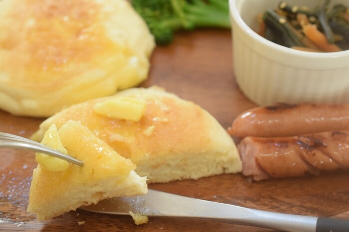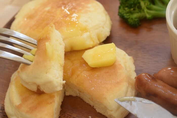 パンケーキは袋から出して、バターをひと切れのせて、電子レンジ600Wで1分くらいチン。(枚数によってバターの溶け具合が違うと思うので調整してください。)
