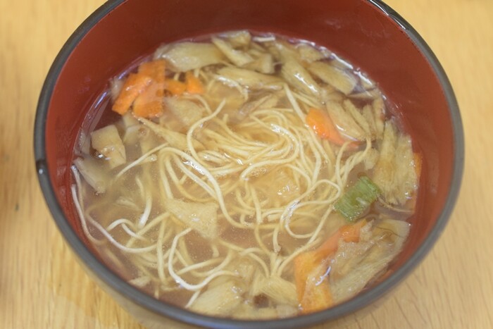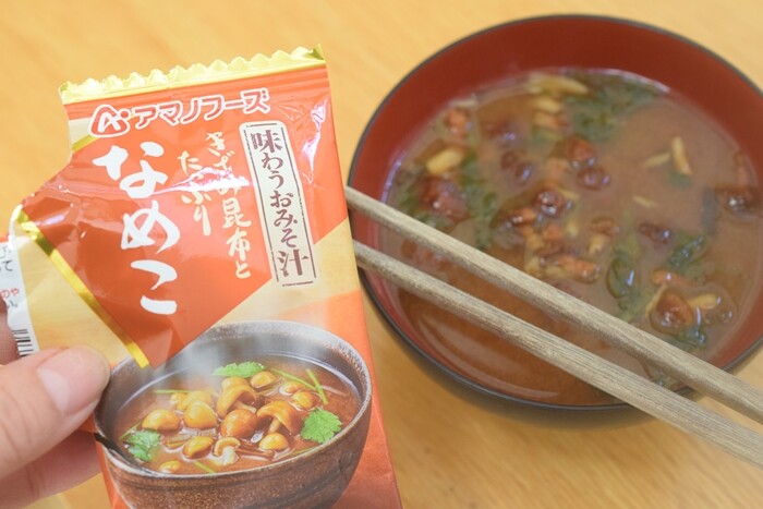 ↓早速、「なめこ」のお味噌汁を作りました。お湯を加えるだけですぐに食べることができます。
