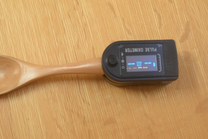 Twitterで、指以外のもの(リップクリーム)を挟んでも測れた(数値をランダムに出すだけの)詐欺商品があったと書かれていたのを見たので、心配になって、木のスプーンを入れてみました。