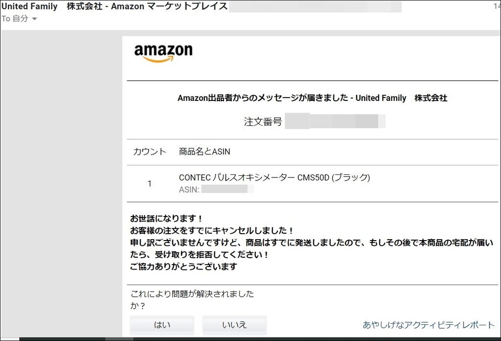 朝Amazonからメールで問題は解決したかとの