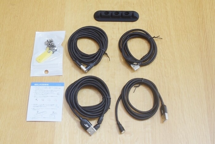4本のケーブルのうち、端子部分が回転する(可動)するケーブルが1mと2mの各1本ずつ。回転しないのが1本ずつです。充電しながら操作する場合は、回転アリの方が便利なので、4本ともそういうのにすればよかったかなと思っています。