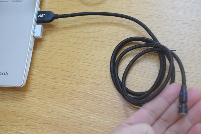 ケーブルを挿すと、先にブルーのライトが付きます。この口がマグネットになっています。