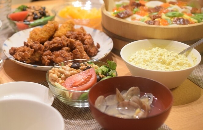 あとは買ってきた鶏のから揚げと牡蠣フライ(笑)