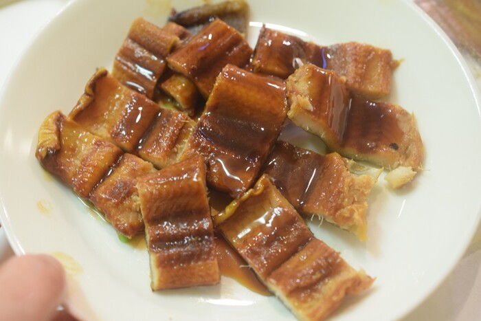 1切れ分をこんな感じに切って、付属のタレをかけてレンジでちょっと温めてちらし寿司にのせまし