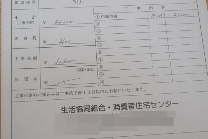 シロアリ消毒だけなので、19.5坪で、46,000円+税でした。