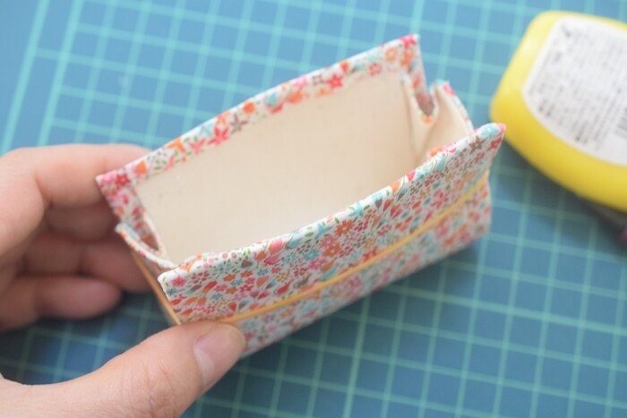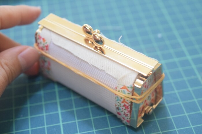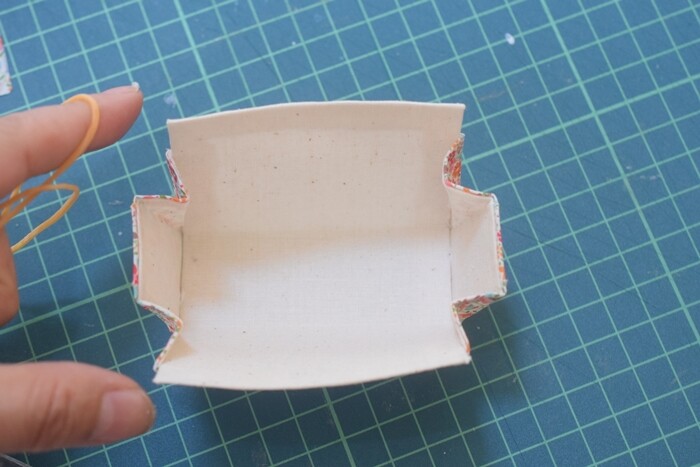 一度立体がま口にはめて、輪ゴムでおさえてボンドが固まるのを待ちます。