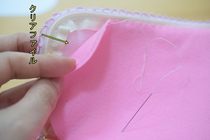 クリアファイルを挟んで、フェルトを上から縫い付けます。