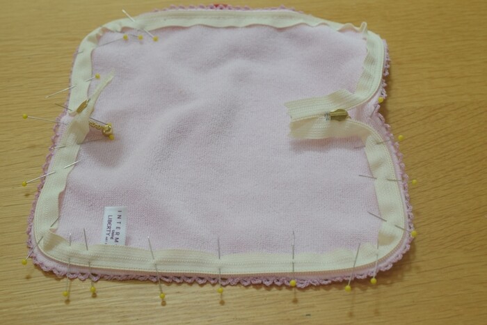まず、タオルの裏側にぐるっとファスナーを縫い付けて~