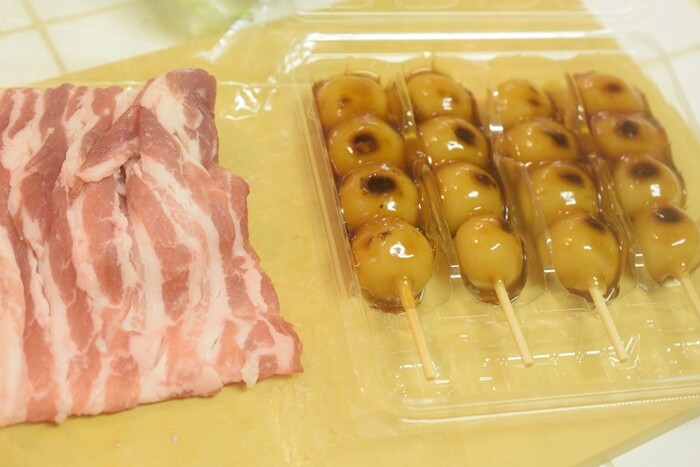材料は、みたらし団子と豚バラ肉の薄切り。