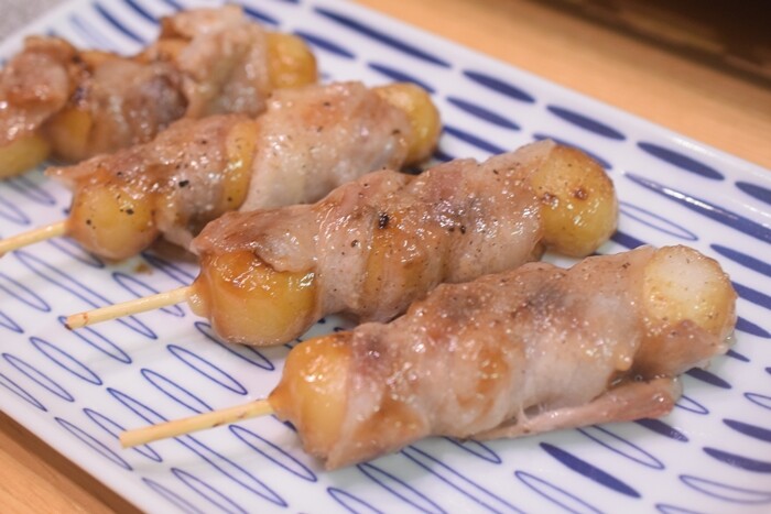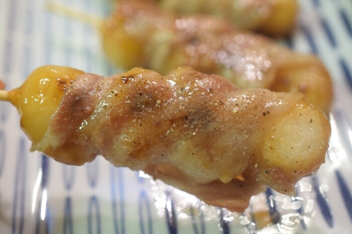 もっと肉をたっぷり巻けばよかったな~と思ったけれど、日本人の好きな餅+甘じょっぱい+豚バラ脂に塩コショウ…美味しいに決まっている💛団子がびよーんと伸びて、美味しかったわよ~