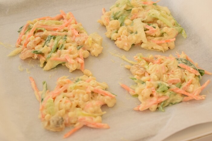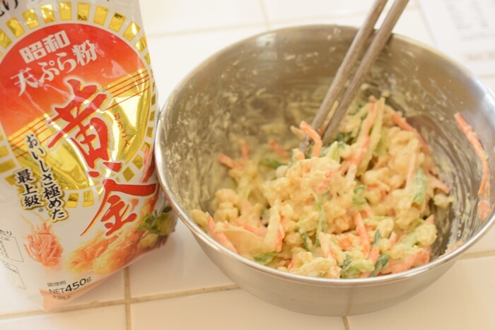 家にあったてんぷら粉、ニンジン、長ネギ、エビ、天かすを混ぜて~(天かすを入れるのがポイント!他の材料は家にあるものでよいと思う^^)