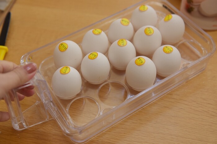 卵は冷蔵庫付属のケースに入れて、これまた一番上の棚に入れています。