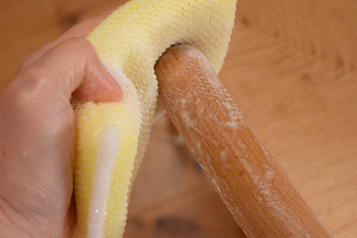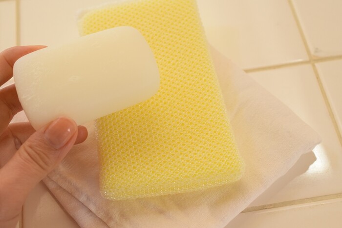 手入れ方法は、純石鹸とスポンジ、布巾を用意して。
