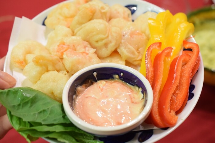 海老のフリッターもレンジでチンして、オーロラソースをつけて食べました♬