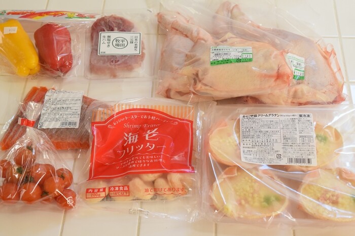 ▼生活クラブで買ったのは、チキン4本、生ハム、スモークサーモン、海老フリッター、かに甲羅クリームグラタン等