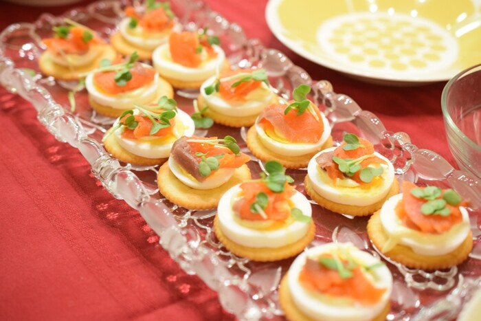 リッツにゆで卵、マヨネーズ、スモークサーモン、かいわれ大根。