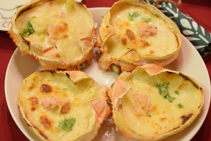かに甲羅クリームグラタンはレンジでチンして温めてからオーブントースターで焼き色を付けました。